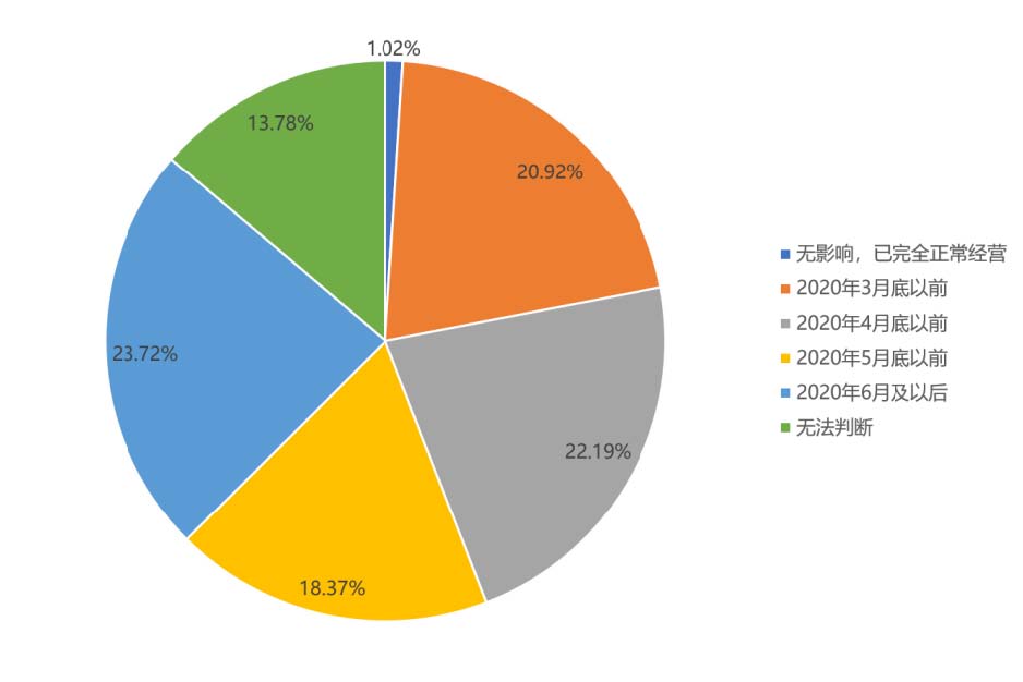 ? ? ??約79%的文化企業認為2020年3月底以前文化企業都不能恢復到正常營業狀態;大約60%的文化企業認為在6月份之前可以正常恢復生產經營;23.72%的文化企業認為要在6月以后才能恢復。對于大多數文化企業來說,由于有幾個月時間不能正常營業,2020年將會是非常艱難的一年。